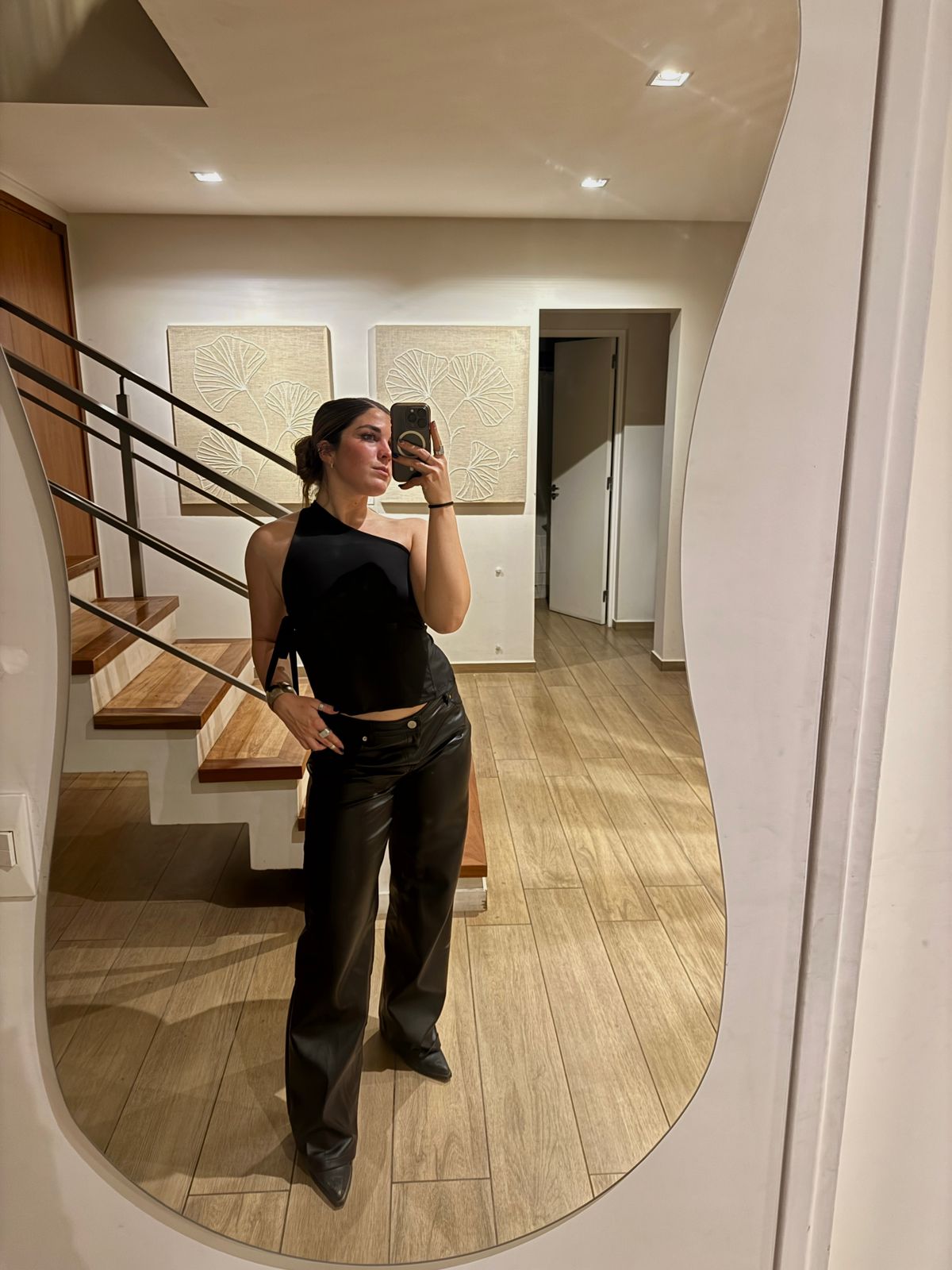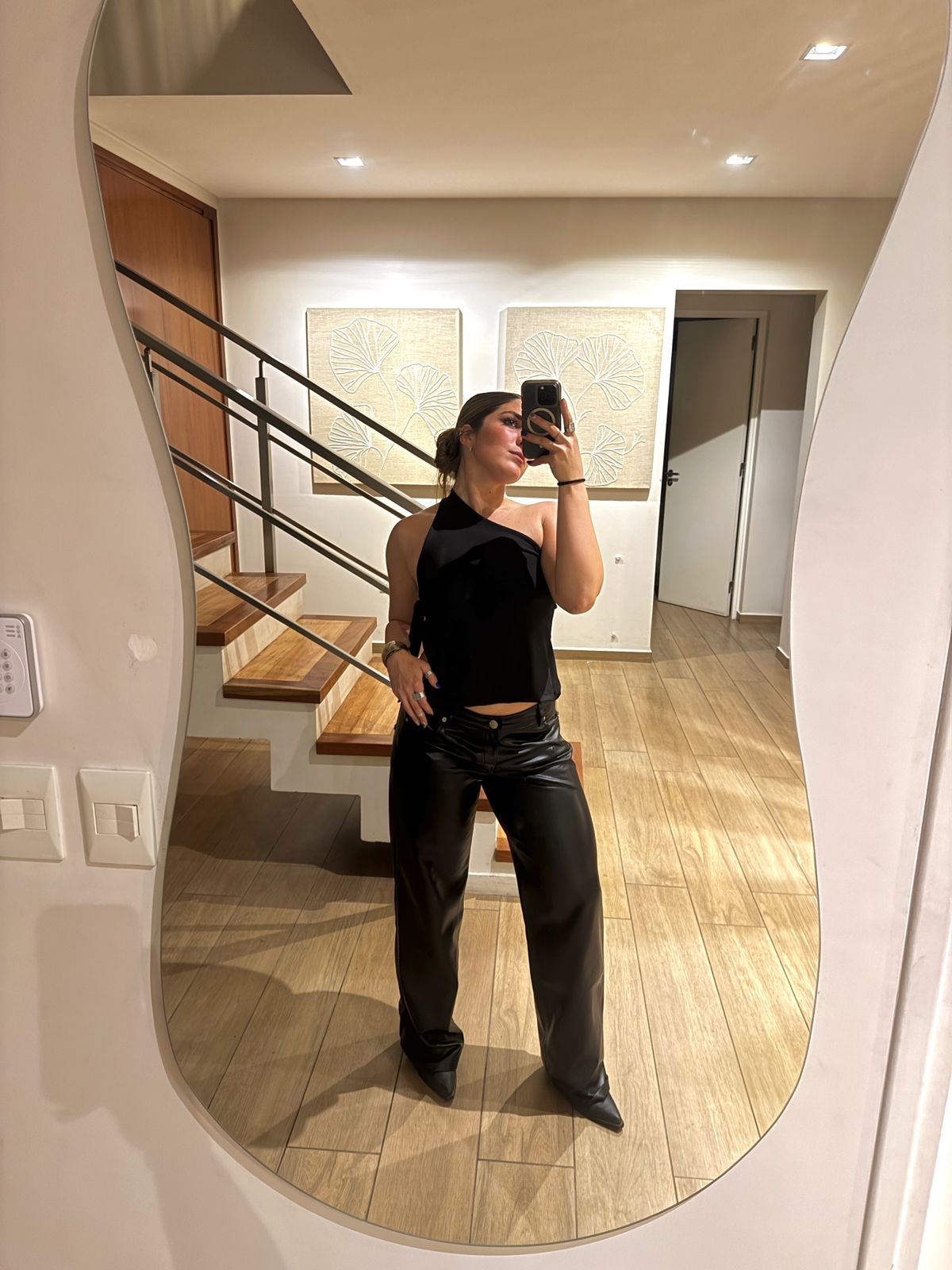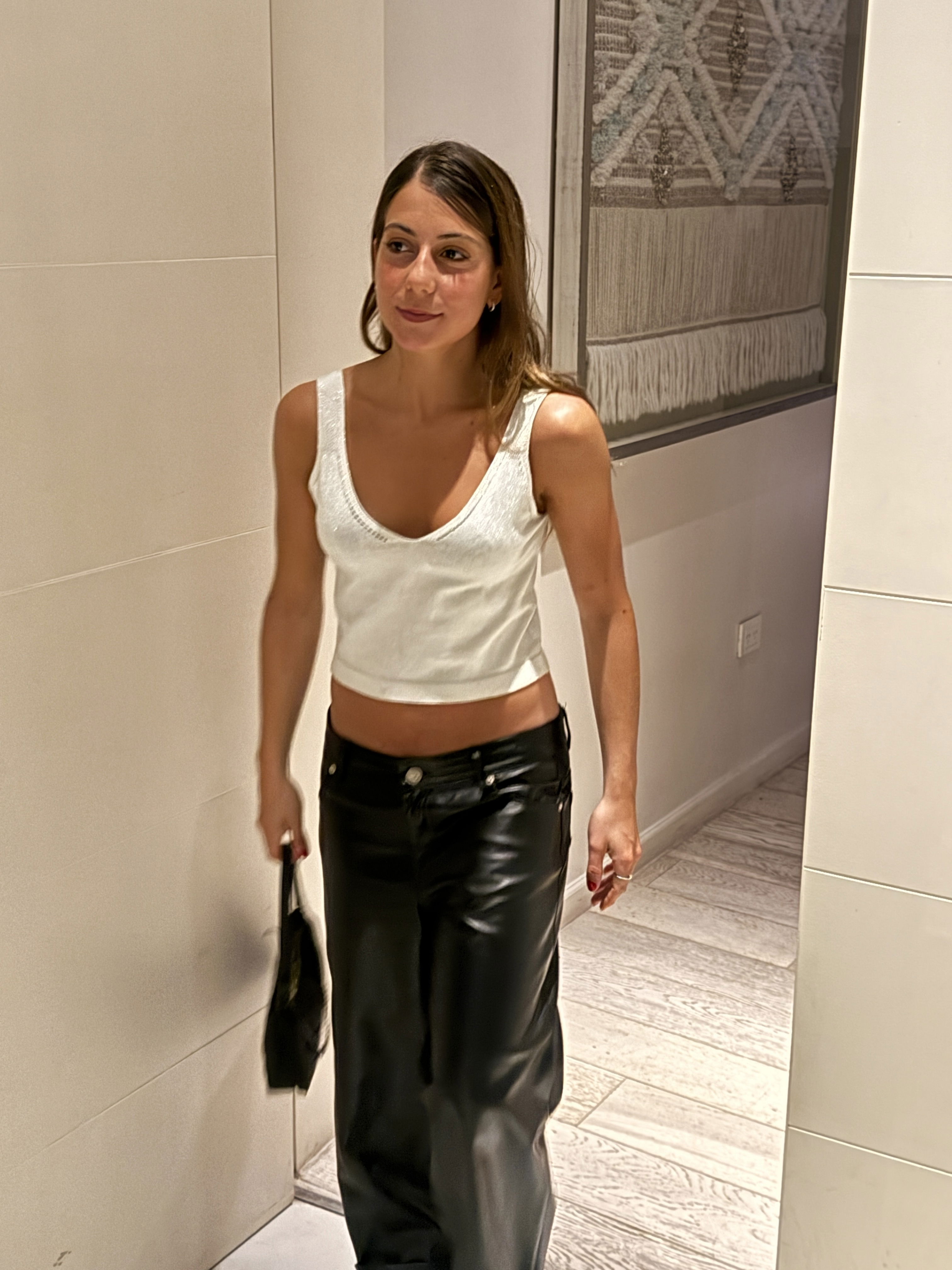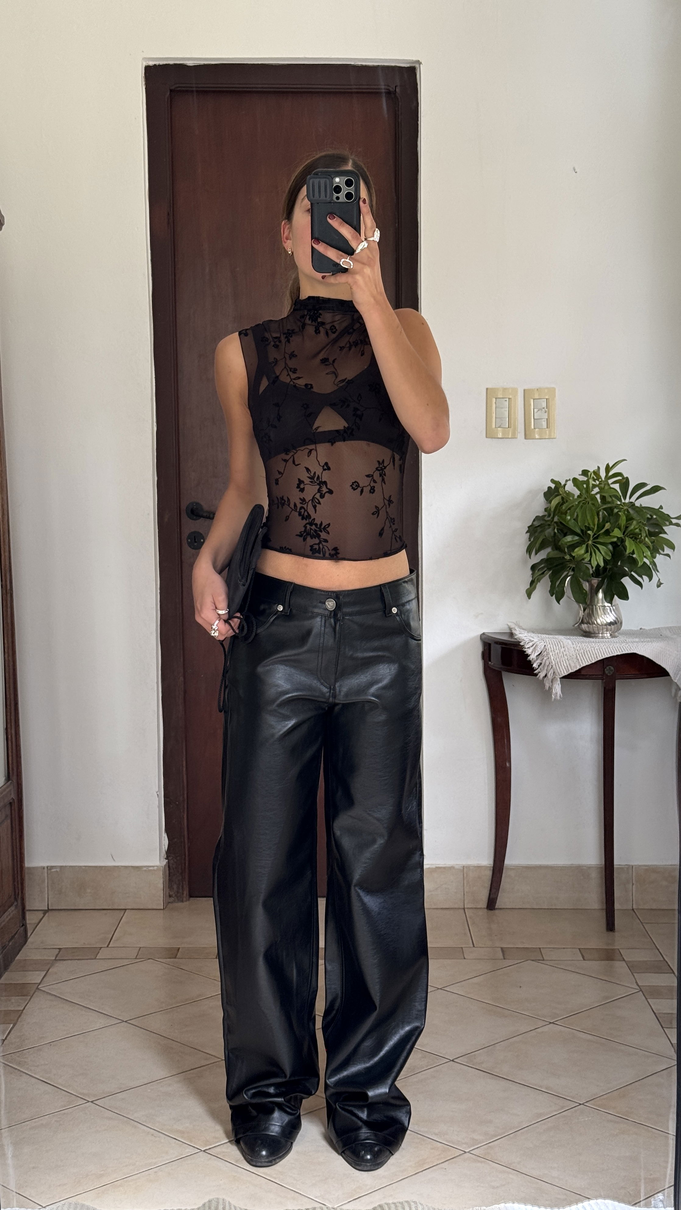 Pantalón recto de cuerina tiro medio-bajo con dos bolsillos delanteros y dos bolsillos traseros. Cintura con presillas y botón zamak personalizado Top White con cartera de cierre metálico. Detalle de chapita de marca en trasero. 50% PU - 50% POLYÉSTER.