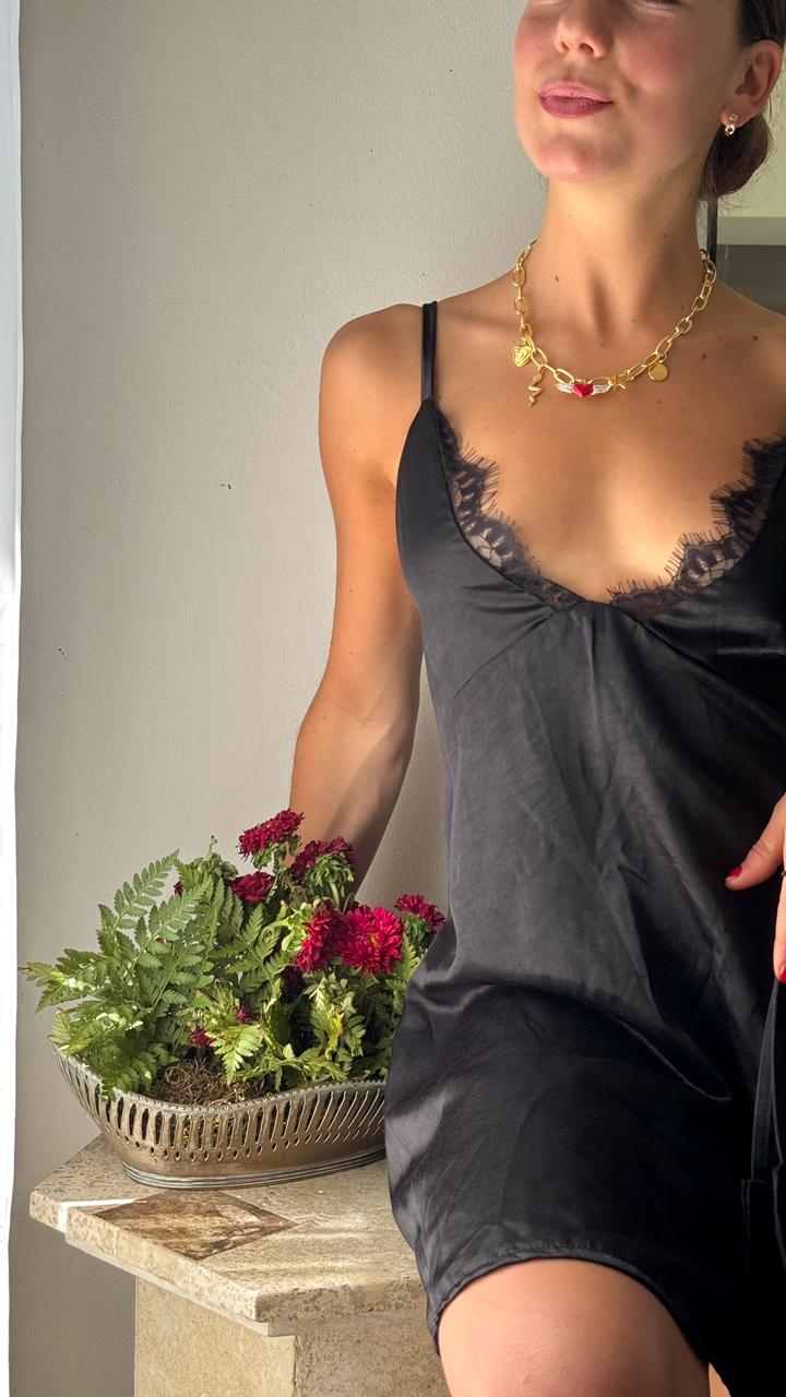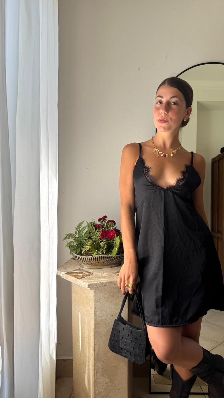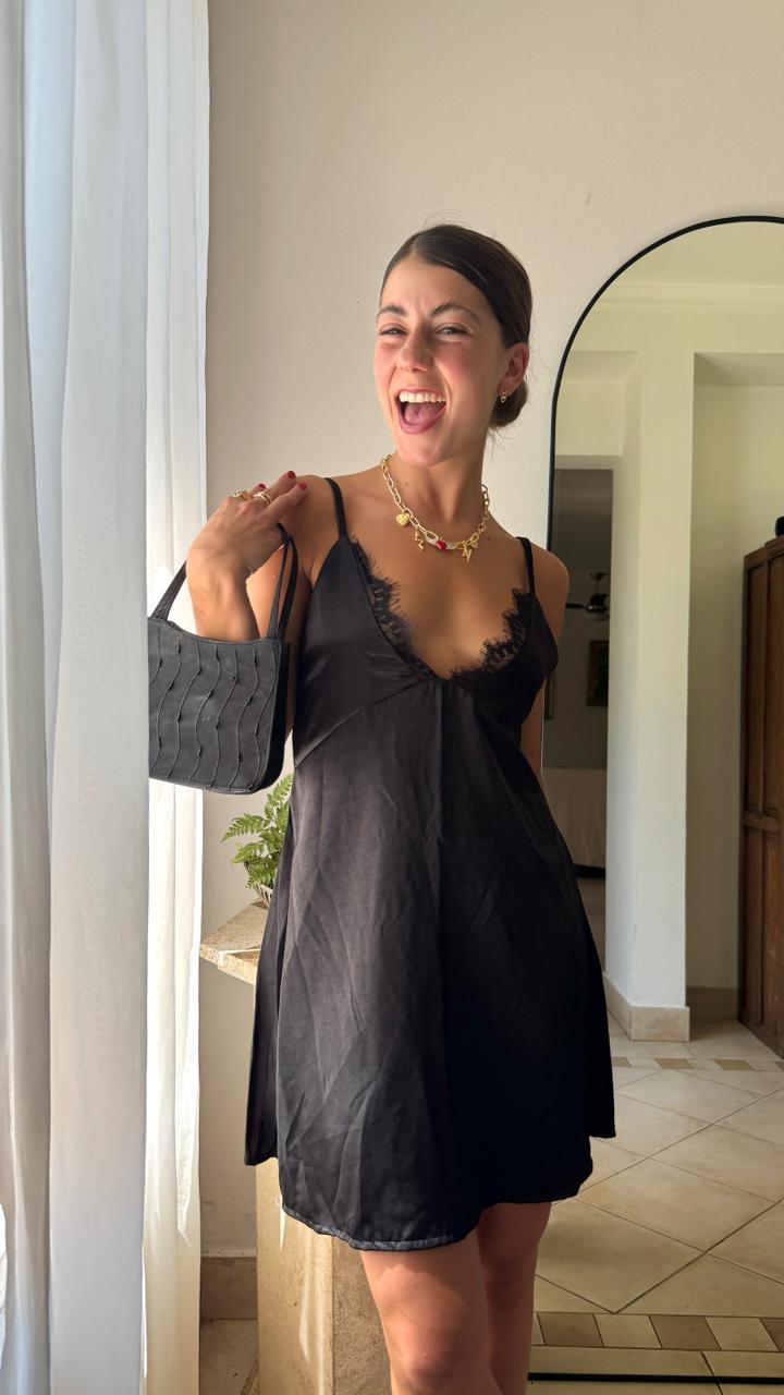 Vestido lencero corto confeccionado en tela sedosa de tacto suave y caída fluida. Presenta escote en V profundo adornado con delicado encaje desflecado, que aporta un toque femenino y romántico. Los finos breteles realzan la ligereza del diseño, mientras que el corte evasé ofrece movimiento y comodidad. Ideal para un look íntimo o para usar como pieza base en conjuntos más sofisticados.