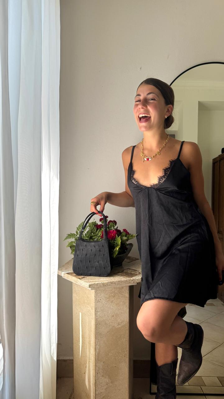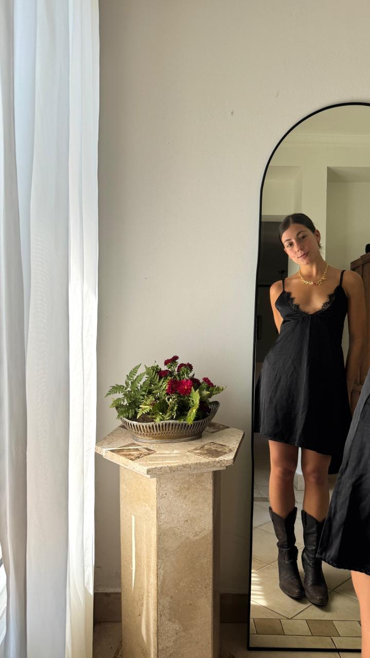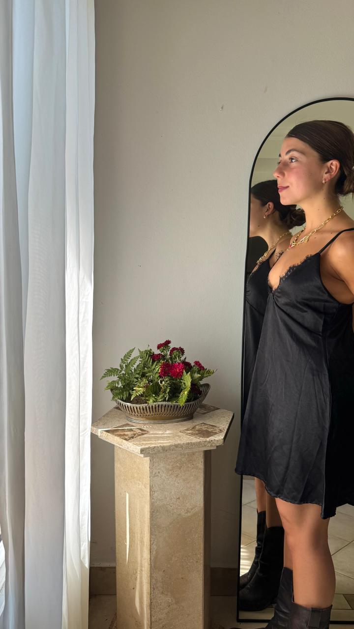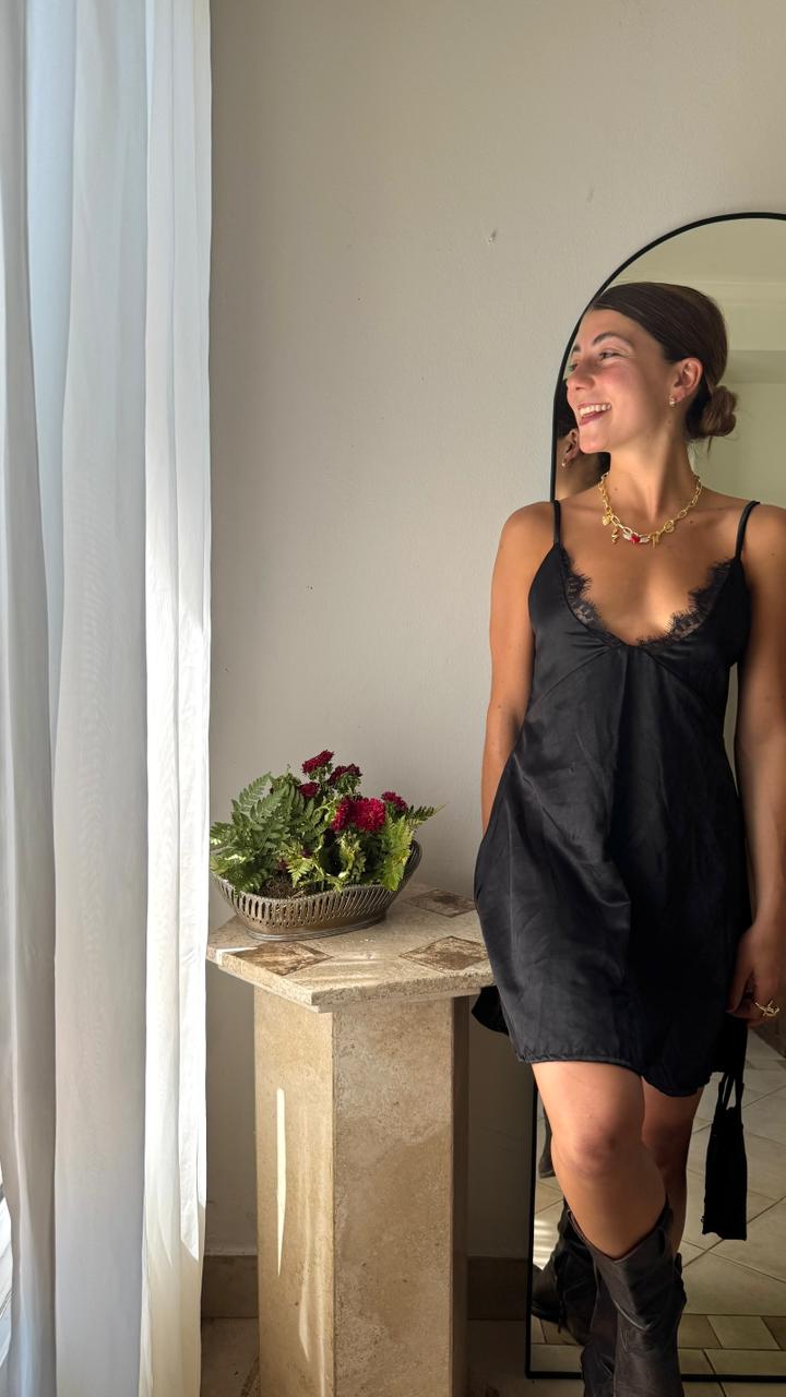 Vestido lencero corto confeccionado en tela sedosa de tacto suave y caída fluida. Presenta escote en V profundo adornado con delicado encaje desflecado, que aporta un toque femenino y romántico. Los finos breteles realzan la ligereza del diseño, mientras que el corte evasé ofrece movimiento y comodidad. Ideal para un look íntimo o para usar como pieza base en conjuntos más sofisticados.