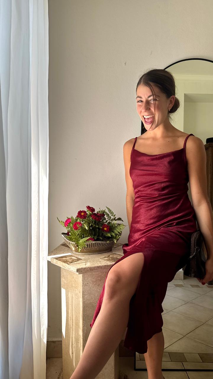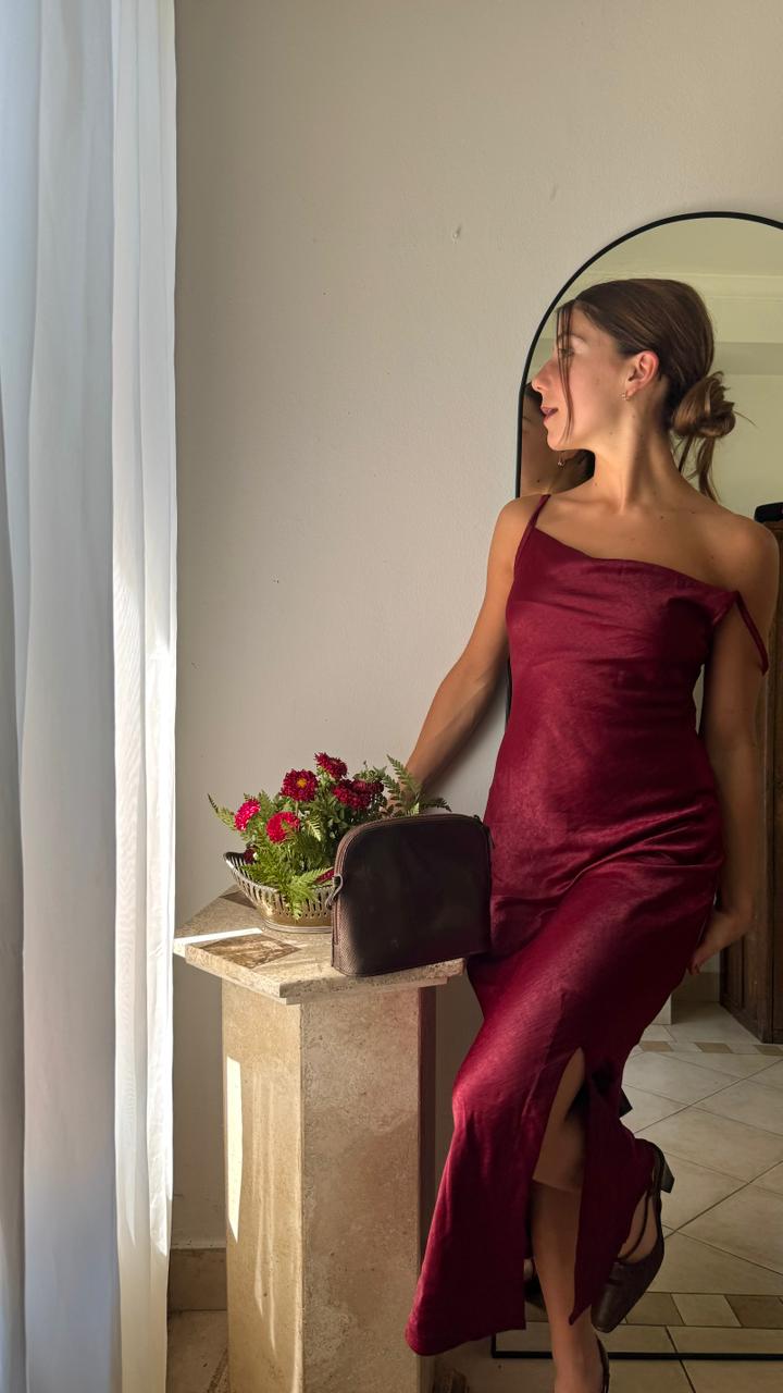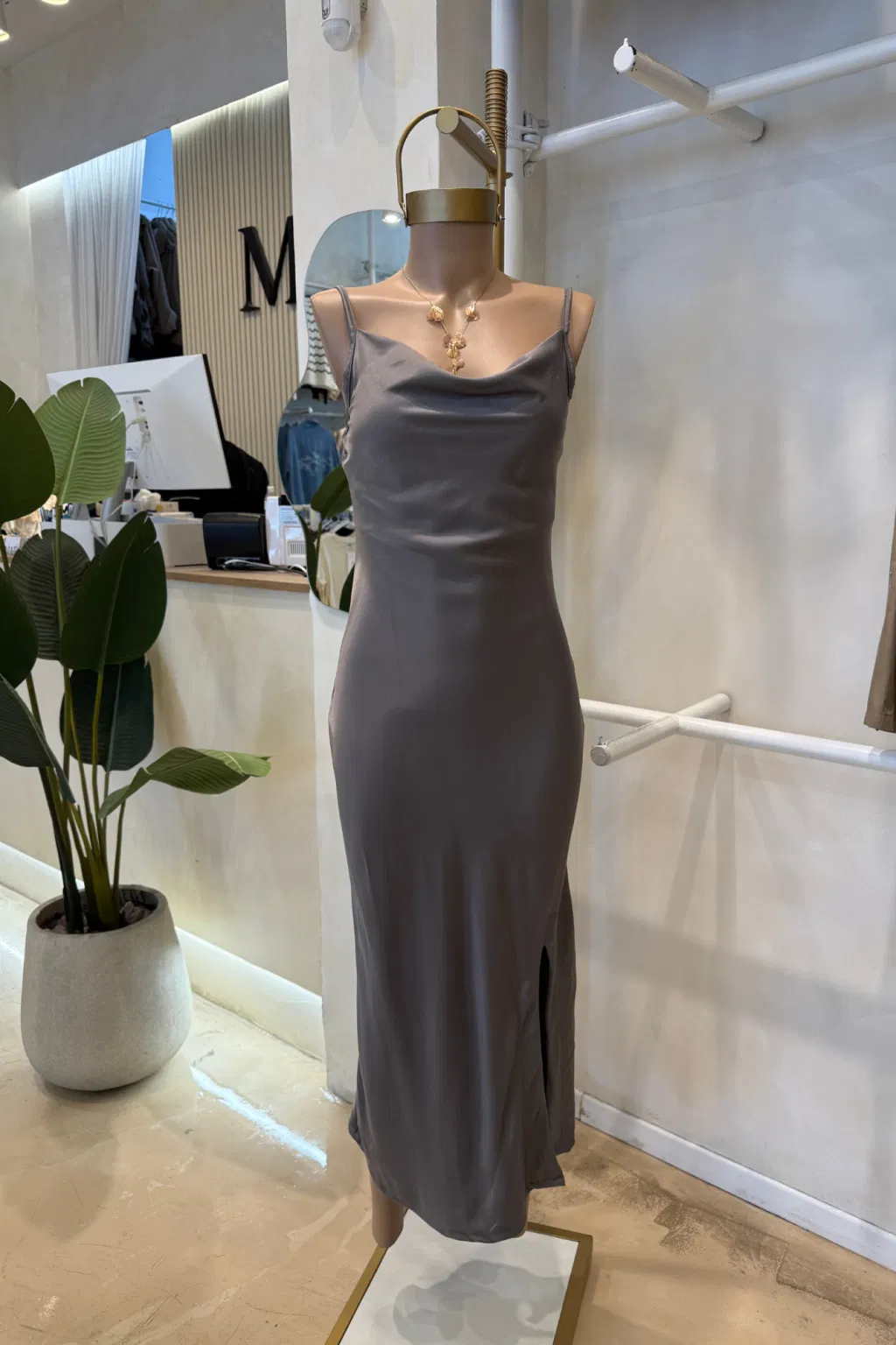 Vestido largo de silueta al cuerpo confeccionado en sedita con una caída suave y elegante. Su escote buche delicado en el delantero aporta un aire romántico y femenino, mientras que el tajo sutil en la falda añade movimiento y un toque de sensualidad.