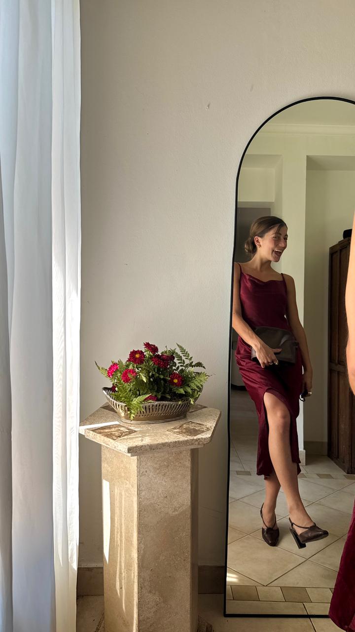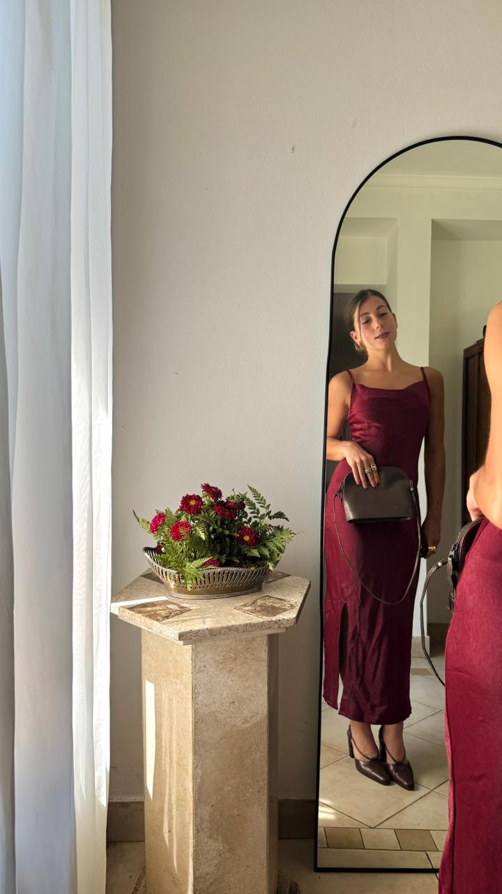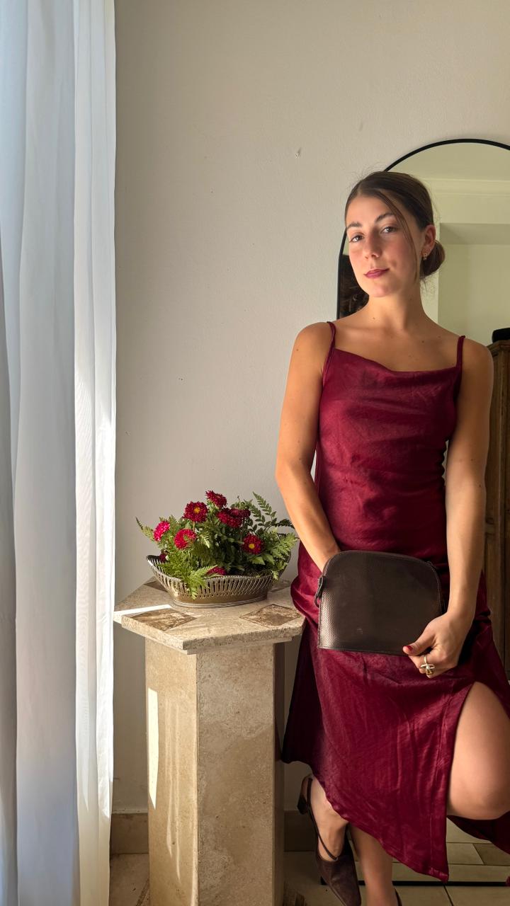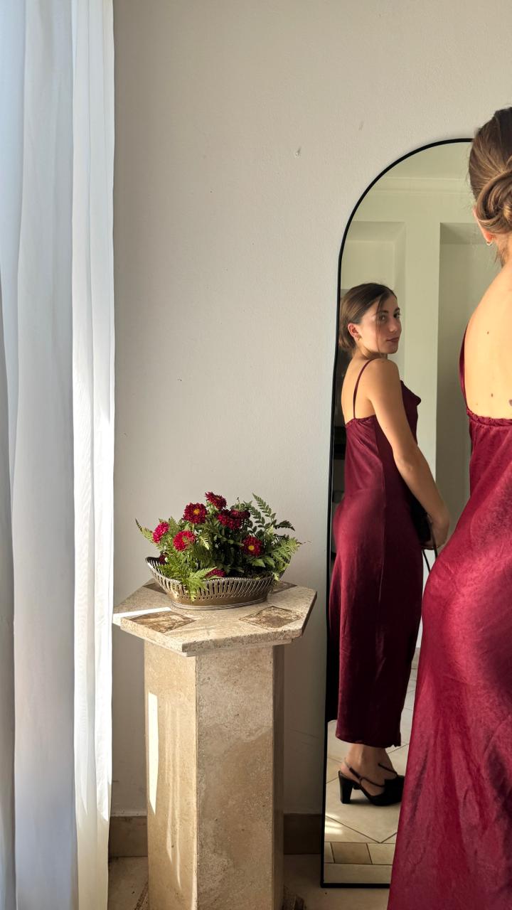 Vestido largo de silueta al cuerpo confeccionado en sedita con una caída suave y elegante. Su escote buche delicado en el delantero aporta un aire romántico y femenino, mientras que el tajo sutil en la falda añade movimiento y un toque de sensualidad.