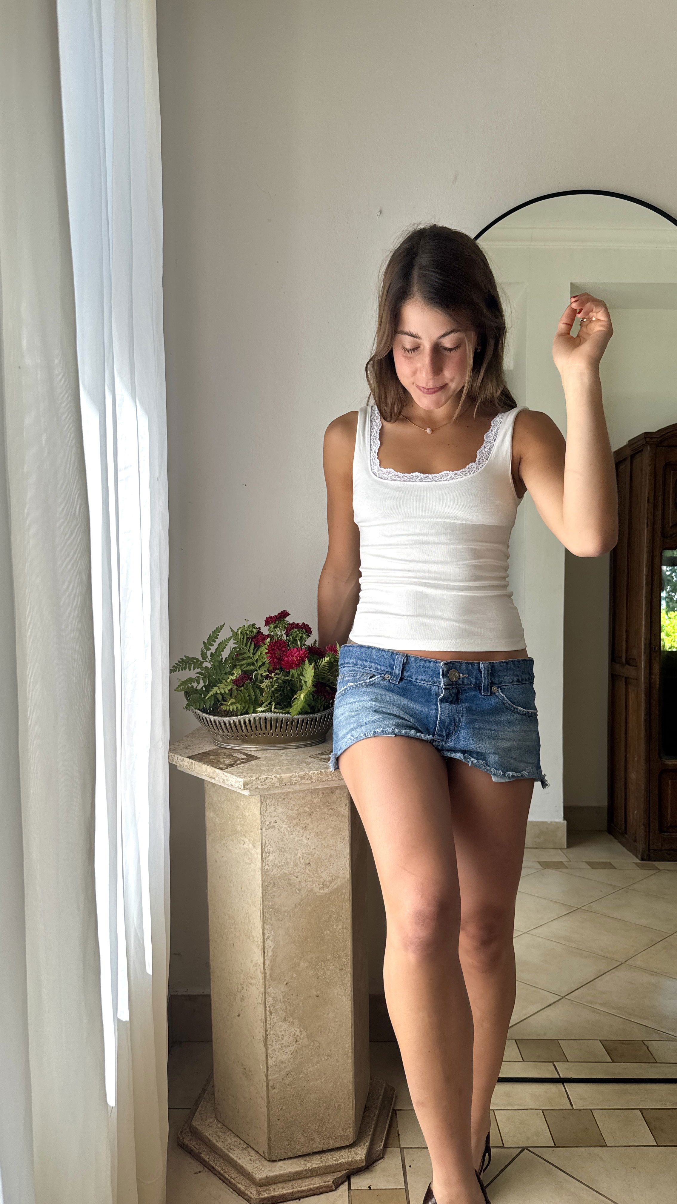 Musculosa confeccionada en tejido ribb, suave y elástico, que se adapta cómodamente al cuerpo. Presenta un delicado detalle de puntilla a tono en el escote, aportando un toque femenino y romántico al diseño. Ideal para usar sola en días cálidos o como prenda base para superposiciones.