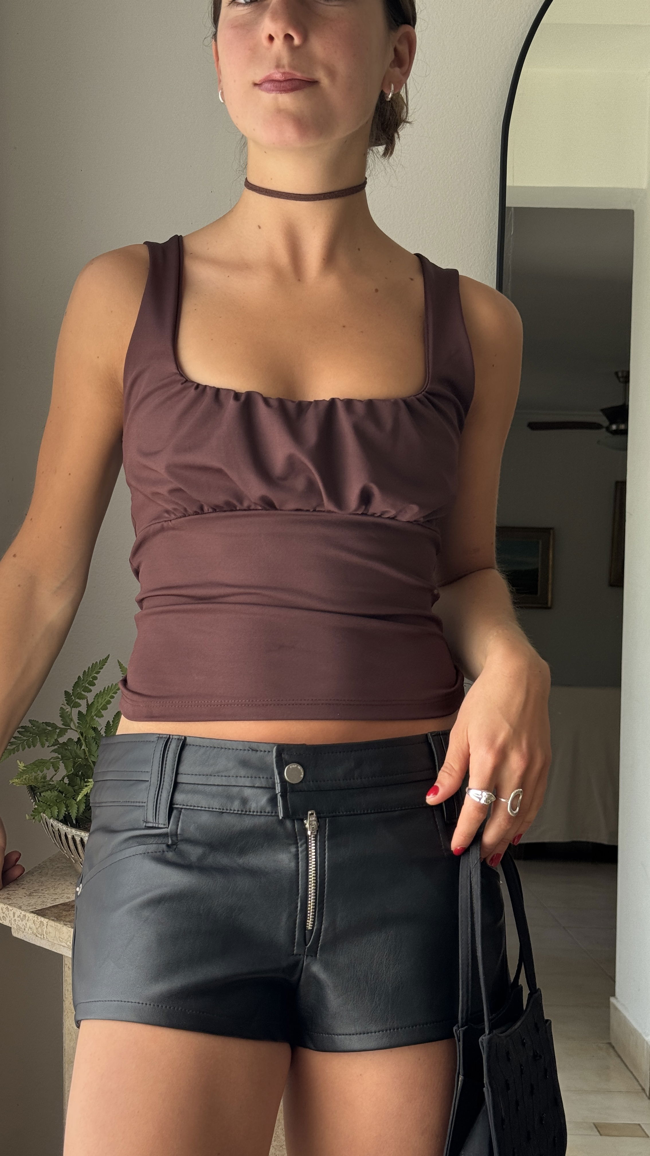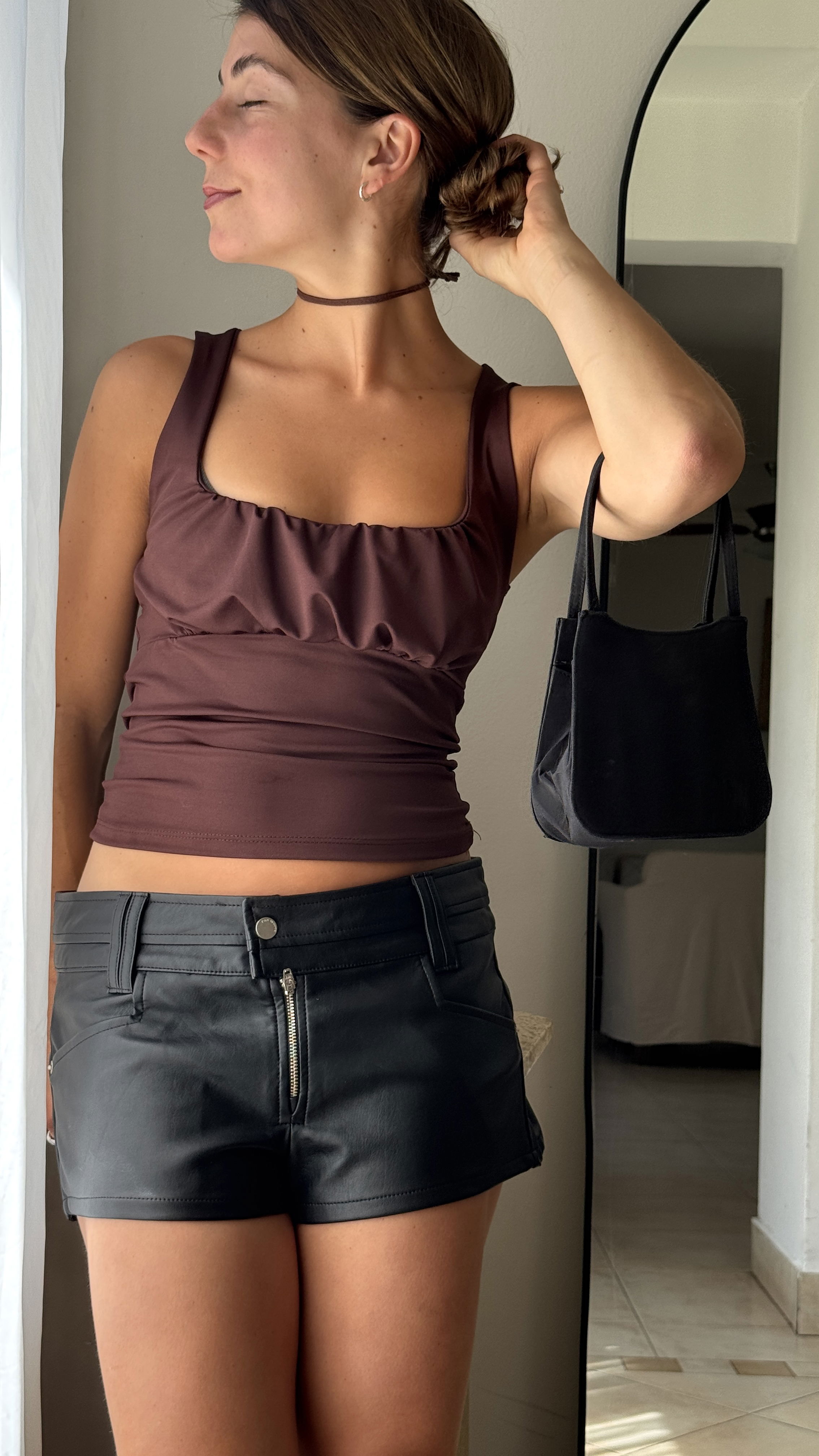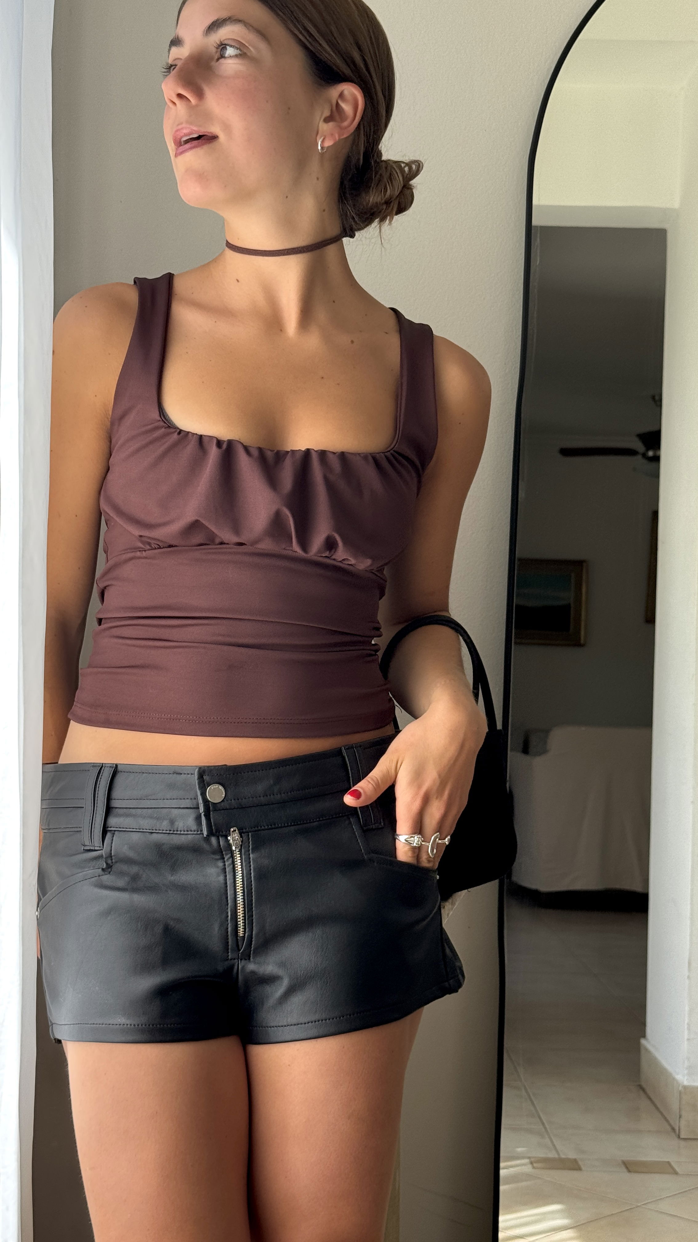 Short de cuerina tiro bajo. Doble cintura -con 4 pares de pasacintos- que cierra cruzado con snap de marca, bolsillos en laterales. Acceso a la prenda mediante cartera de cierre metálico ykk.