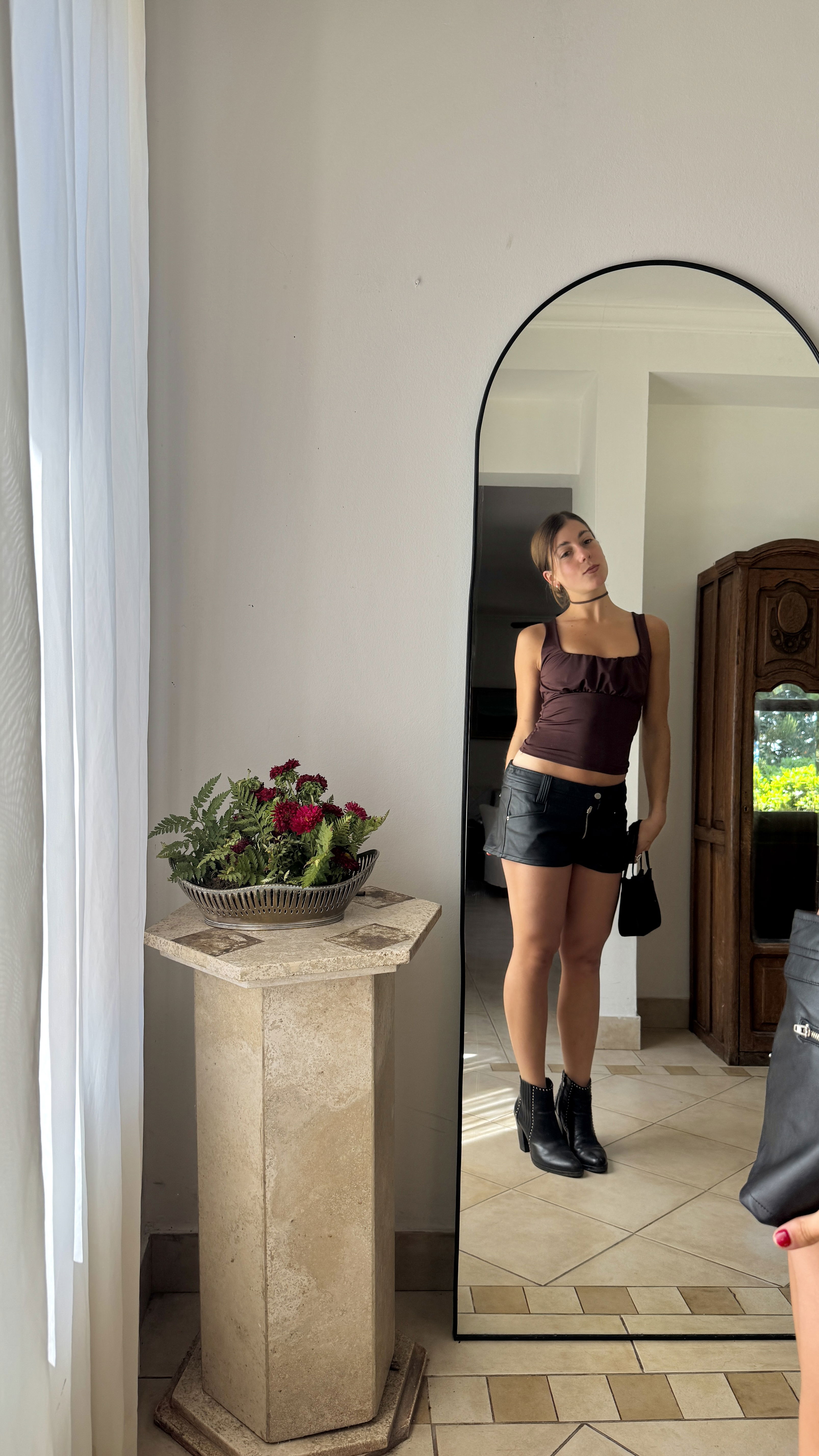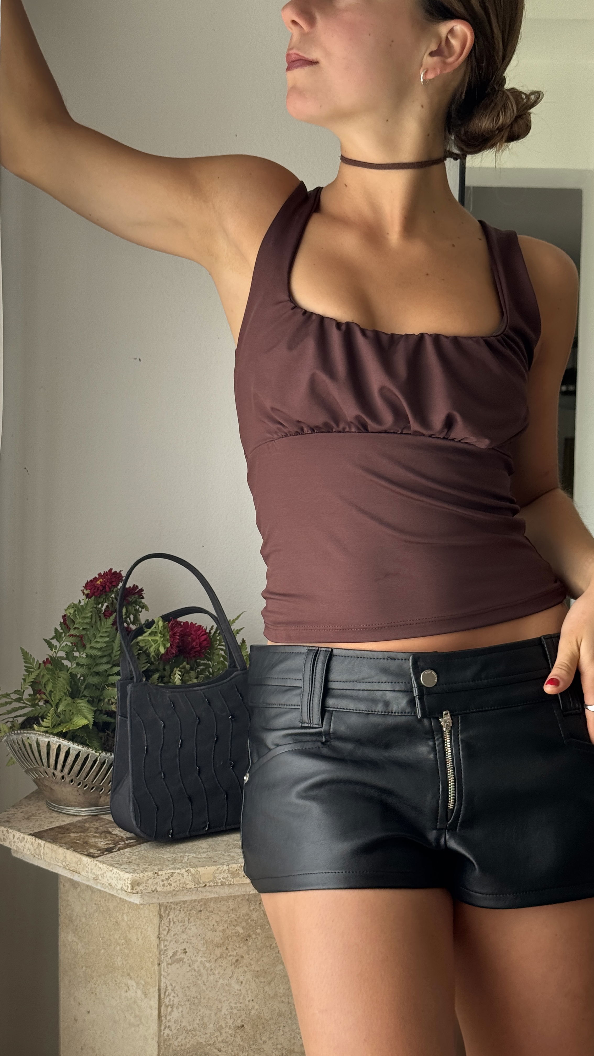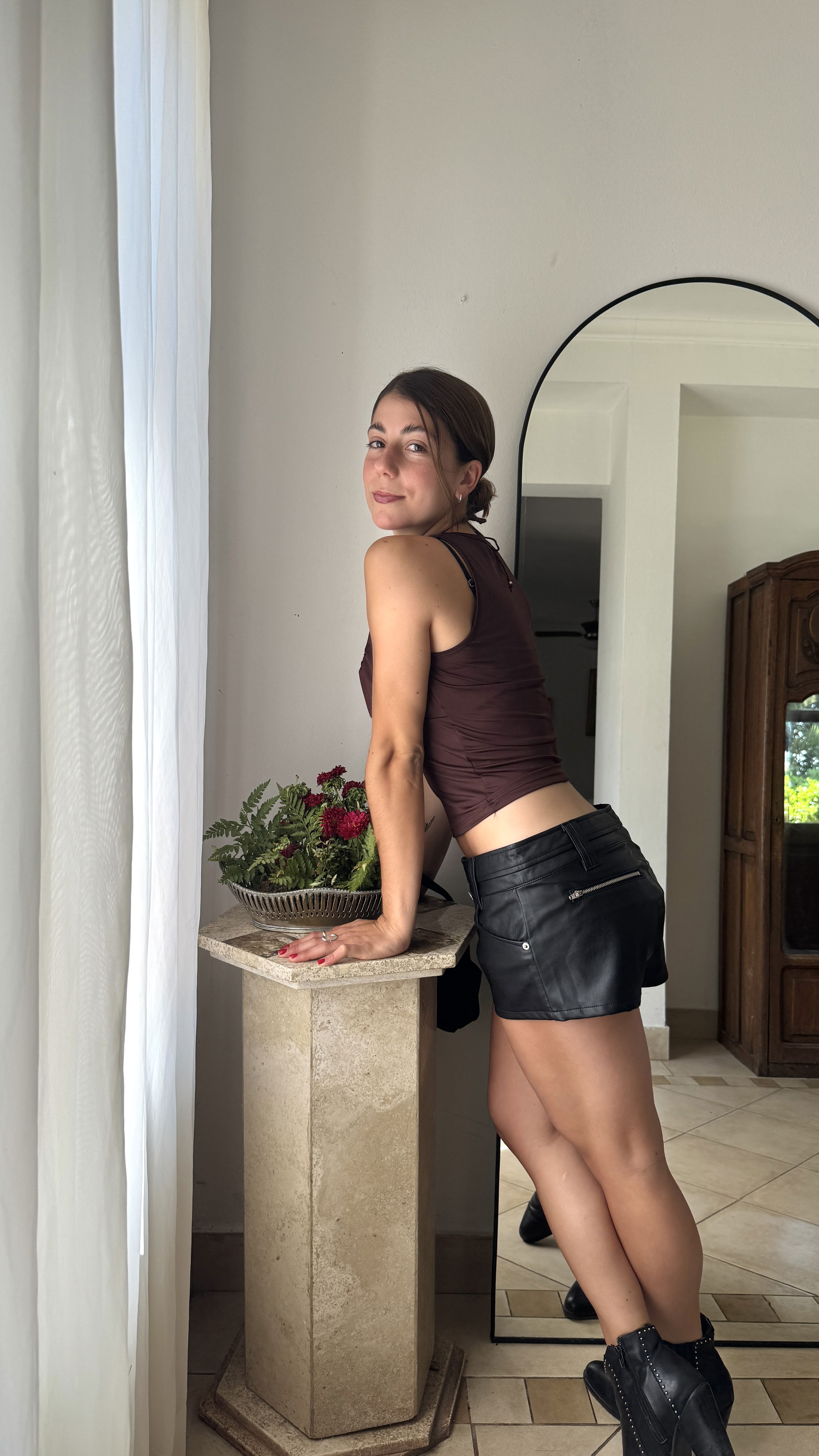 Short de cuerina tiro bajo. Doble cintura -con 4 pares de pasacintos- que cierra cruzado con snap de marca, bolsillos en laterales. Acceso a la prenda mediante cartera de cierre metálico ykk.