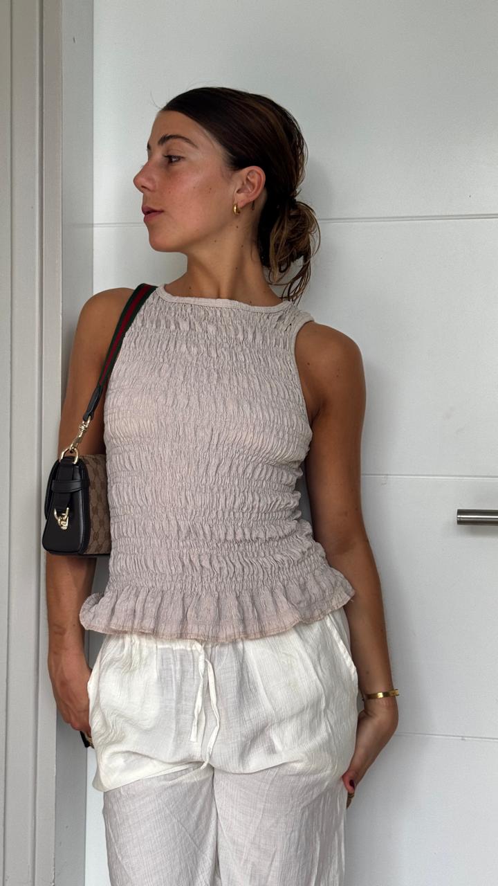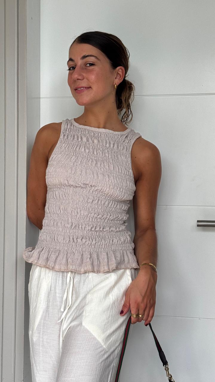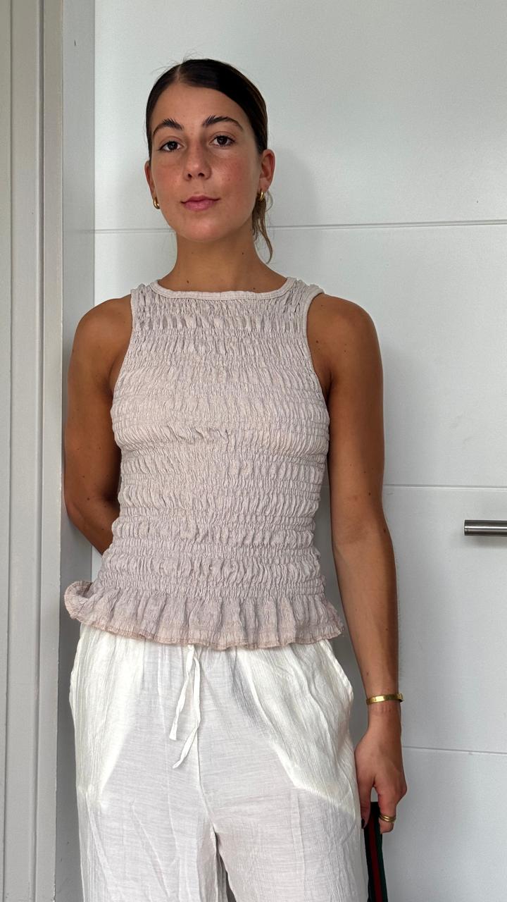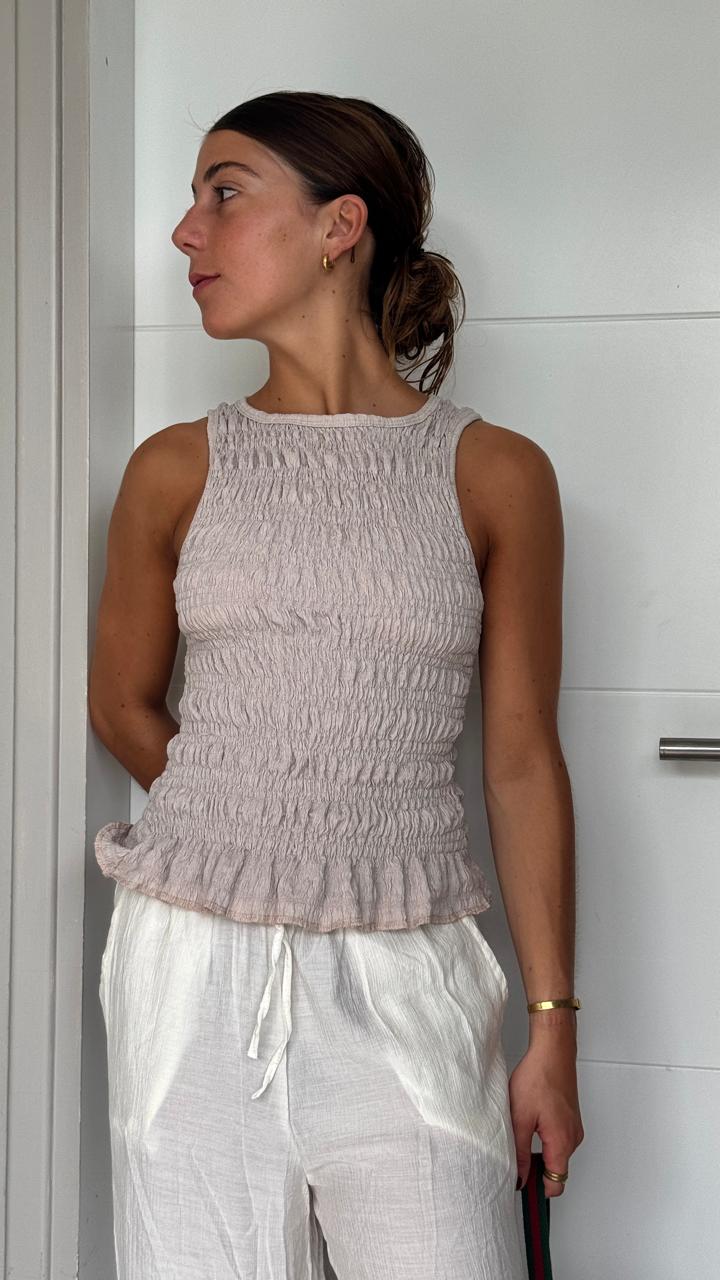 Top confeccionado en jersey elastizado y suave de altísima calidad, con frunces multiagujas en todo el cuerpo que permiten un calce flexible, cómodo y completamente adaptado a la silueta. El diseño sin mangas aporta frescura, mientras que el detalle de volado en el ruedo da un toque femenino y moderno.