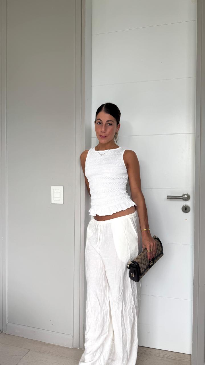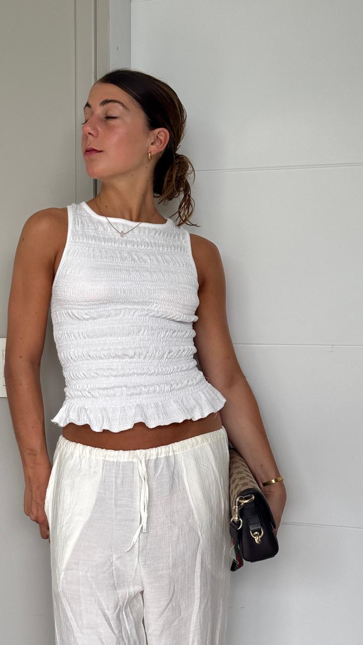 Top confeccionado en jersey elastizado y suave de altísima calidad, con frunces multiagujas en todo el cuerpo que permiten un calce flexible, cómodo y completamente adaptado a la silueta. El diseño sin mangas aporta frescura, mientras que el detalle de volado en el ruedo da un toque femenino y moderno.