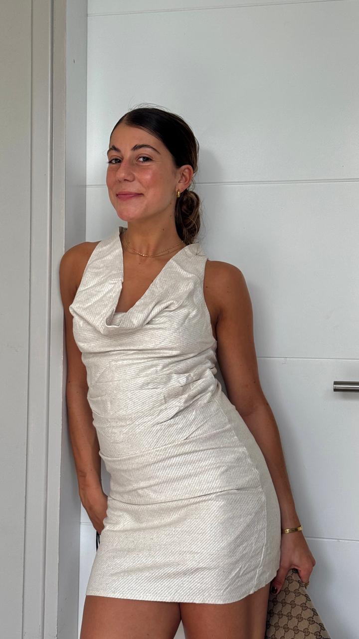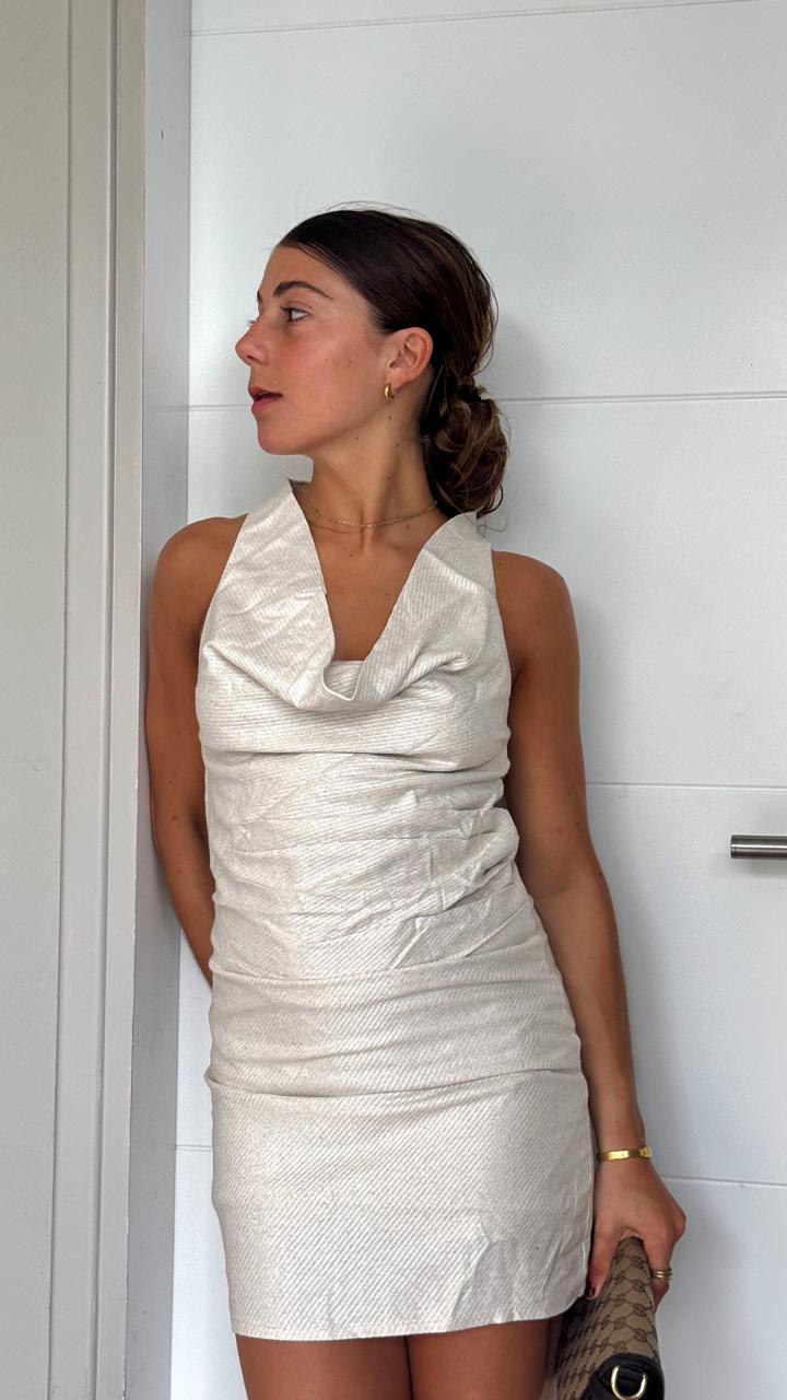 Vestido confeccionado en lino con lurex plateado, aportando un brillo sutil y sofisticado ideal para la temporada festiva. Posee escote con buche frontal que genera una caída delicada, y frunces laterales en la cintura que permiten ajustar y realzar la figura de manera favorecedora. Incorpora cierre invisible lateral para un acceso cómodo y prolijo.