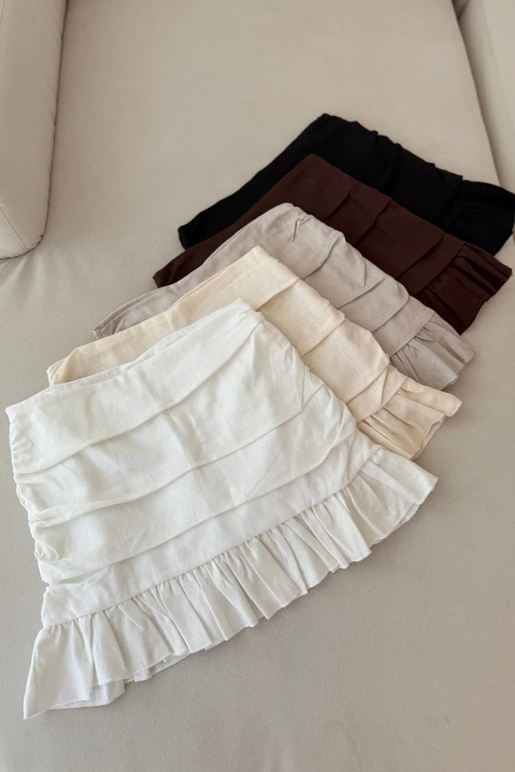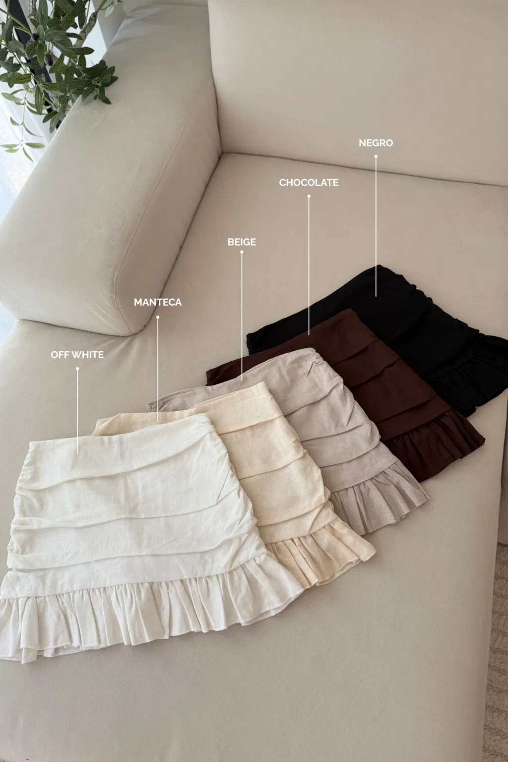 Descripción: Falda de lino con frunces laterales y volados inferiores que aportan un movimiento delicado y femenino. Está completamente forrada para asegurar comodidad y una caída impecable. La terminación con roulotte en el ruedo garantiza un acabado prolijo y sofisticado. Cuenta con un cierre invisible de costado que mantiene la estética limpia y elegante. Además, el frunce en el centro de la espalda realza la figura, brindando un ajuste favorecedor.